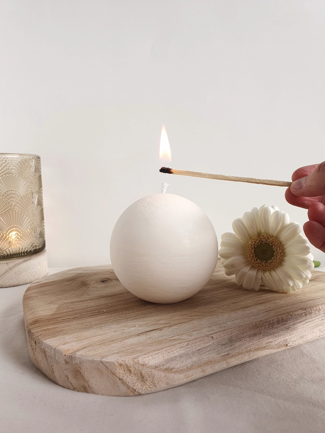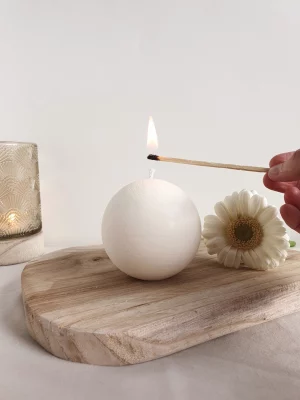 Een unieke kaars in bolvorm die zowel decoratief als functioneel is.